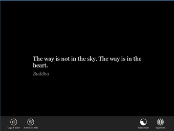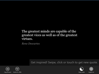 Forismaticを起動すると、画面に偉人の言葉と作者名が表示されます。Forismaticには2つのモードがあり、右クリックで表示される右下のアイコンで切り替えができます。「Inspire Me」では、表示されている文章をクリックまたは左にフリップするたびに自分のタイミングで格言を見ることができますし、「Relaxation Mode」では仕事中や煮詰まって一息入れたいときに、自動で格言を次々と再生してくれます。一度インストールすると、ホーム画面でも格言と作者を自動再生するようになります。